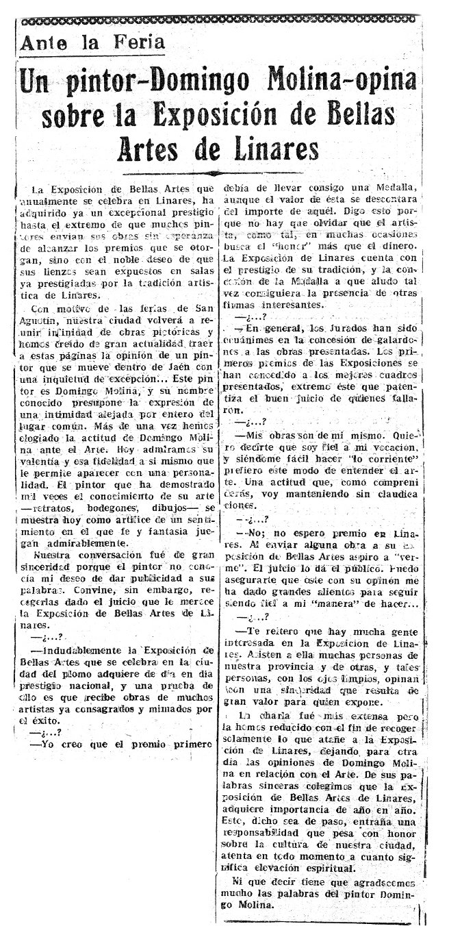 10 mayo, 1954 1950-1959 Un pintor -Domingo Molina- opina sobre la exposición de Bellas Artes de Linares