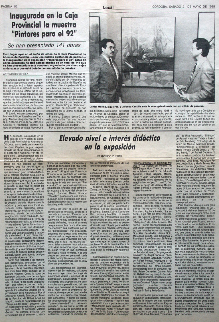 21 mayo, 1988 1980-1989 Inaugurada en la Caja Provincial la muestra «Pintores para el 92». Elevado nivel e interés didáctico en la exposición.