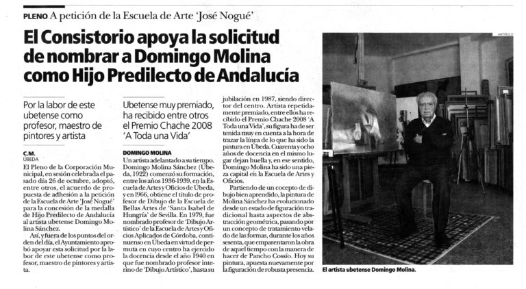 12 noviembre, 2010 2010-2019 El Consistorio apoya la solicitud de nombrar a Domingo Molina como Hijo Predilecto de Andalucía