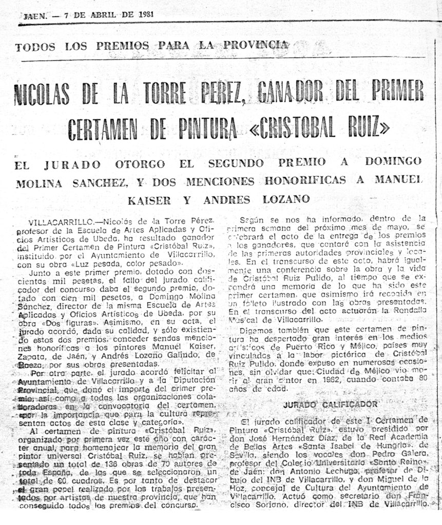 Nicolás de la Torre Pérez, ganador del primer certamen de pintura «Cristóbal Ruiz»
